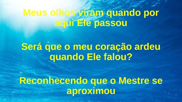 - Meus olhos viram quando por aqui Ele passouSerá que o meu coração ardeu quando Ele falou?Reconhecendo que o Mestre se aproximou