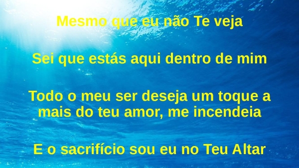 - Mesmo que eu não Te vejaSei que estás aqui dentro de mimTodo o meu ser deseja um toque a mais do teu amor, me incendeiaE o sacrifício sou eu no Teu Altar