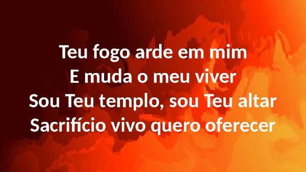- Teu fogo arde em mimE muda o meu viverSou Teu templo, sou Teu altarSacrifício vivo quero oferecer