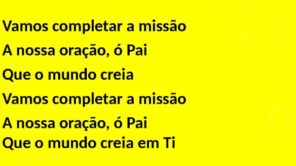 - Vamos completar a missão A nossa oração, ó Pai Que o mundo creia Vamos completar a missão A nossa oração, ó Pai Que o mundo creia em Ti (ô, ele creia em Ti)