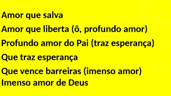 - Amor que salva Amor que liberta Profundo amor do Pai Que traz esperança Que vence barreiras Imenso amor de Deus