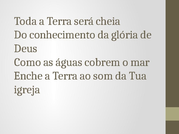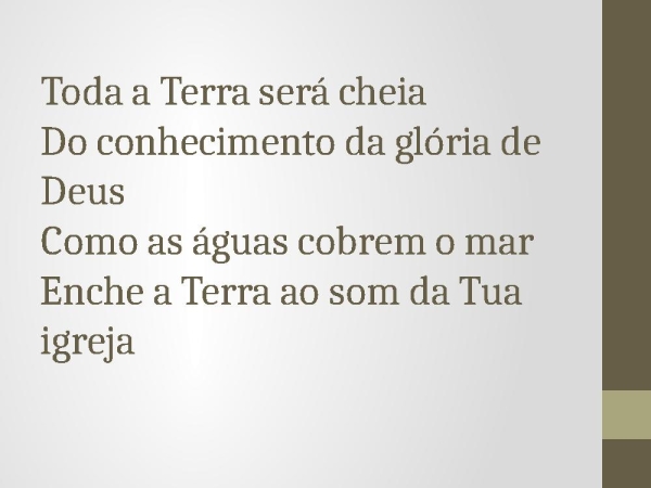 - Toda a Terra será cheiaDo conhecimento da glória de DeusComo as águas cobrem o marEnche a Terra ao som da Tua igreja