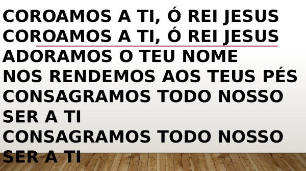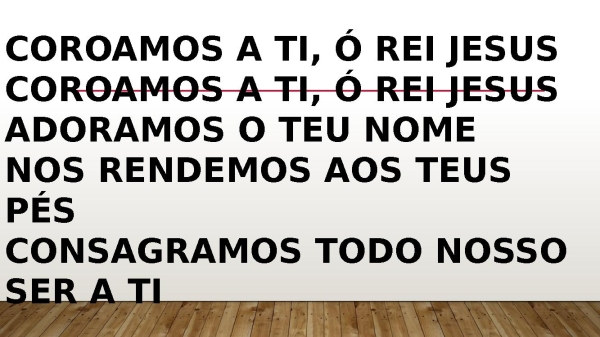 - Coroamos a Ti, ó Rei Jesus Coroamos a Ti, ó Rei Jesus Adoramos o Teu nome Nos rendemos aos Teus pés Consagramos todo nosso ser a Ti Consagramos todo nosso ser a Ti