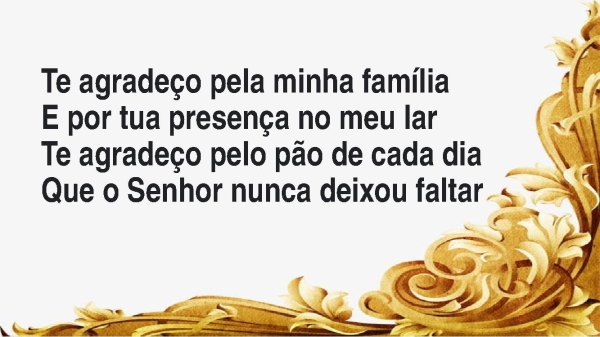 - Te agradeço pela minha famíliaE por tua presença no meu larTe agradeço pelo pão de cada diaQue o Senhor nunca deixou faltar