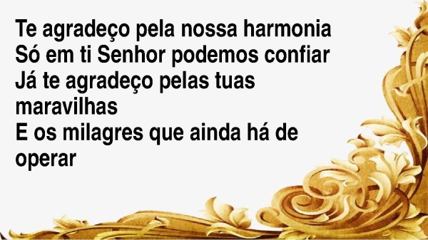 - Te agradeço pela nossa harmoniaSó em ti Senhor podemos confiarJá te agradeço pelas tuas maravilhasE os milagres que ainda há de operar