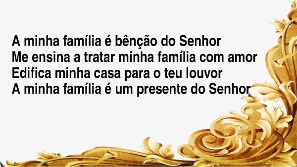 - A minha família é bênção do SenhorMe ensina a tratar minha família com amorEdifica minha casa para o teu louvorA minha família é um presente do Senhor