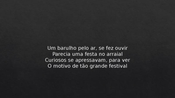 - Um barulho pelo ar, se fez ouvirParecia uma festa no arraialCuriosos se apressavam, para verO motivo de tão grande festival