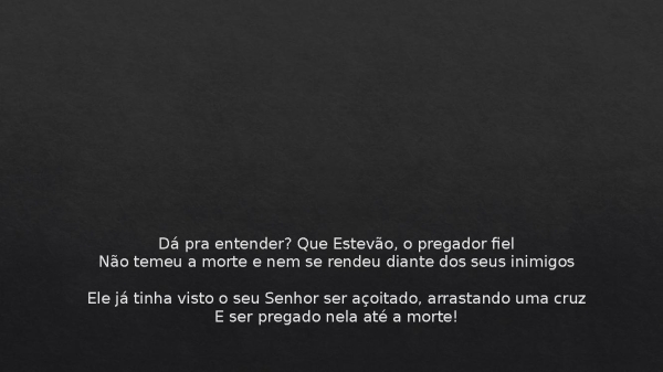 - Dá pra entender? Que Estevão, o pregador fielNão temeu a morte e nem se rendeu diante dos seus inimigosEle já tinha visto o seu Senhor ser açoitado, arrastando uma cruzE ser pregado nela até a morte!