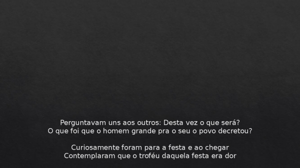 - Perguntavam uns aos outros: Desta vez o que será?O que foi que o homem grande pra o seu o povo decretou?Curiosamente foram para a festa e ao chegarContemplaram que o troféu daquela festa era dor