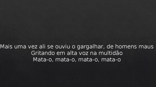 - Mais uma vez ali se ouviu o gargalhar, de homens mausGritando em alta voz na multidãoMata-o, mata-o, mata-o, mata-o