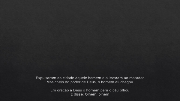 - Expulsaram da cidade aquele homem e o levaram ao matadorMas cheio do poder de Deus, o homem ali chegouEm oração a Deus o homem para o céu olhouE disse: Olhem, olhem