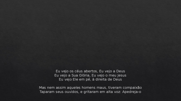 - Eu vejo os céus abertos, Eu vejo a DeusEu vejo a Sua Glória, Eu vejo o meu JesusEu vejo Ele em pé, à direita de DeusMas nem assim aqueles homens maus, tiveram compaixãoTaparam seus ouvidos, e gritaram em alta voz: Apedreja-o