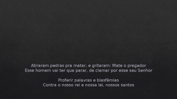 - Atiraram pedras pra matar, e gritaram: Mate o pregadorEsse homem vai ter que parar, de clamar por esse seu SenhorProferir palavras e blasfêmiasContra o nosso rei e nossa lei, nossos santos