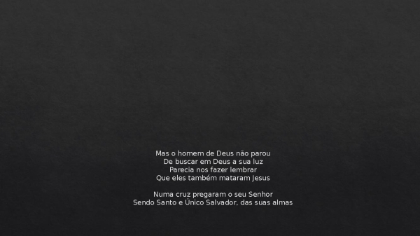 - Mas o homem de Deus não parouDe buscar em Deus a sua luzParecia nos fazer lembrarQue eles também mataram JesusNuma cruz pregaram o seu SenhorSendo Santo e Único Salvador, das suas almas