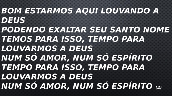 - Bom estarmos aqui louvando a Deus Podendo exaltar Seu santo nome Temos para isso, tempo para louvarmos a Deus Num só amor, num só espírito Tempo para isso, tempo para louvarmos a Deus Num só amor, num só espírito (2)