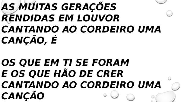 - As muitas gerações Rendidas em louvor Cantando ao Cordeiro uma canção, é Os que em Ti se foram E os que hão de crer Cantando ao Cordeiro uma canção