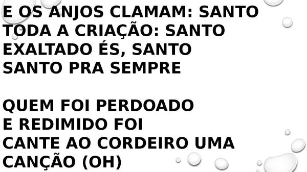 - E os anjos clamam: Santo Toda a criação: Santo Exaltado És, Santo Santo pra sempre Quem foi perdoado E redimido foi Cante ao Cordeiro uma canção (oh)