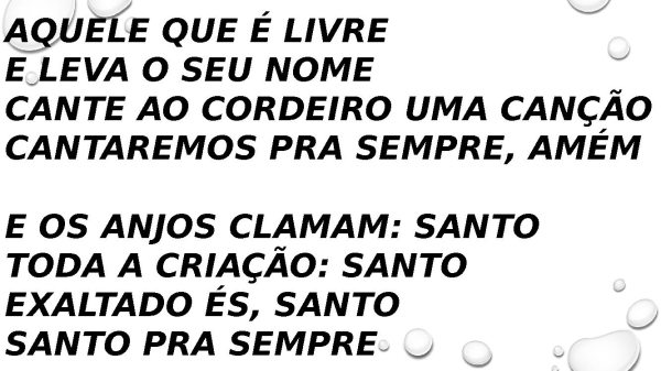 - Aquele que é livre E leva o Seu nome Cante ao Cordeiro uma canção Cantaremos pra sempre, amém E os anjos clamam: Santo Toda a criação: Santo Exaltado És, Santo Santo pra sempre
