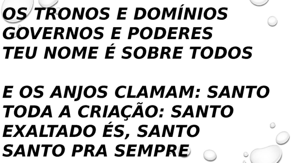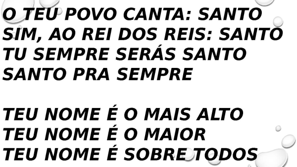 - O Teu povo canta: Santo Sim, ao Rei dos reis: Santo Tu sempre serás Santo Santo pra sempre Teu nome é o mais alto Teu nome é o maior Teu nome é sobre todos