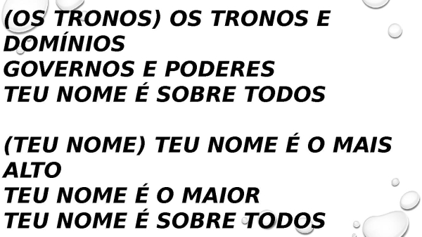 - (Os tronos) os tronos e domínios Governos e poderes Teu nome é sobre todos (Teu nome) Teu nome é o mais alto Teu nome é o maior Teu nome é sobre todos