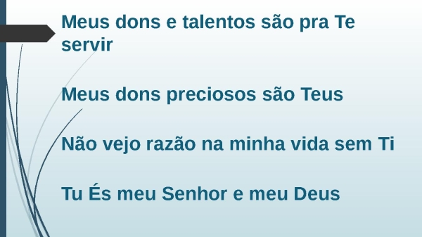 - Meus dons e talentos são pra Te servirMeus dons preciosos são TeusNão vejo razão na minha vida sem TiTu És meu Senhor e meu Deus