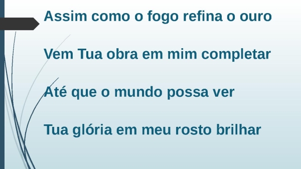 - Assim como o fogo refina o ouroVem Tua obra em mim completarAté que o mundo possa verTua glória em meu rosto brilhar