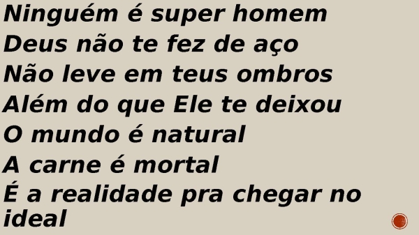 - Ninguém é super homem Deus não te fez de aço Não leve em teus ombros Além do que Ele te deixou O mundo é natural A carne é mortal É a realidade pra chegar no ideal