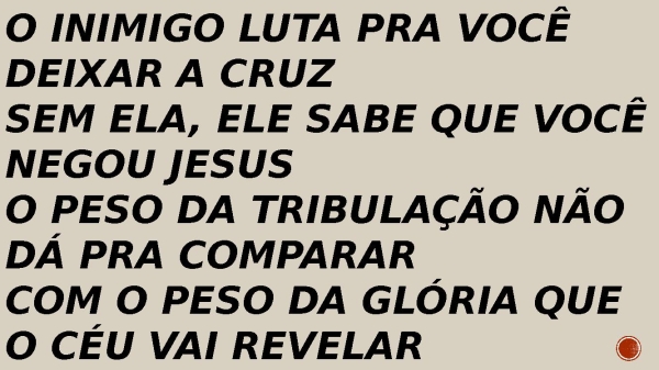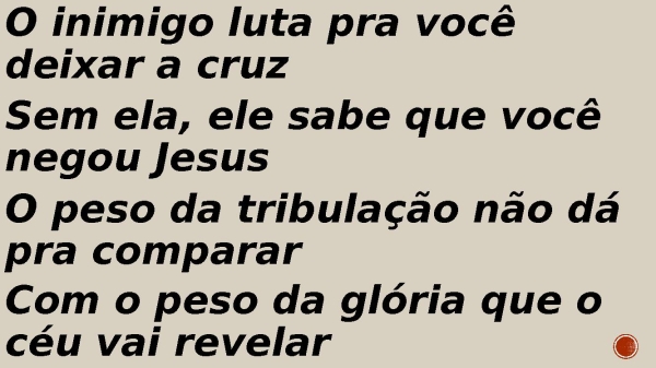 - O inimigo luta pra você deixar a cruz Sem ela, ele sabe que você negou Jesus O peso da tribulação não dá pra comparar Com o peso da glória que o céu vai revelar