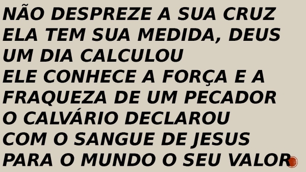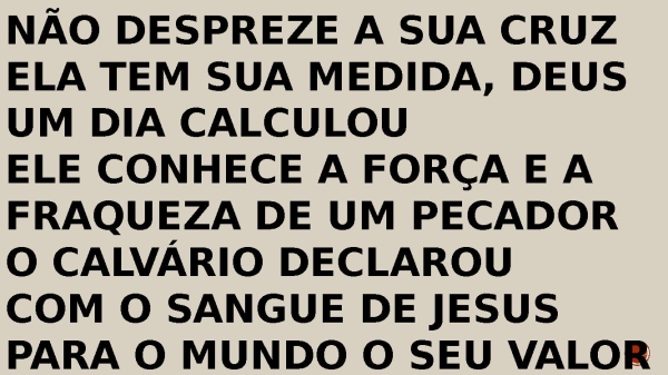 - Não despreze a sua cruz Ela tem sua medida, Deus um dia calculou Ele conhece a força e a fraqueza de um pecador O calvário declarou Com o sangue de Jesus Para o mundo o seu valor