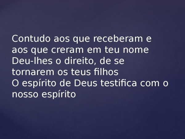 - Contudo aos que receberam e aos que creram em teu nomeDeu-lhes o direito, de se tornarem os teus filhosO espírito de Deus testifica com o nosso espírito