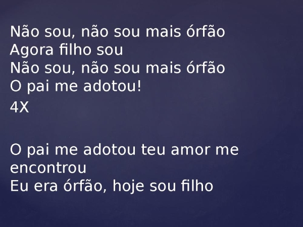 - Não sou, não sou mais órfãoAgora filho souNão sou, não sou mais órfãoO pai me adotou!4XO pai me adotou teu amor me encontrouEu era órfão, hoje sou filho