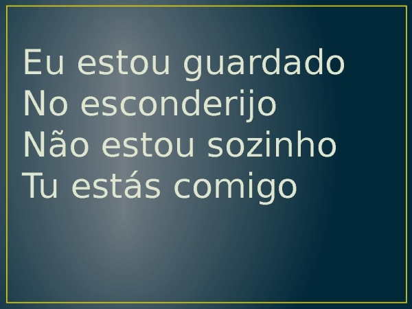 - Eu estou guardadoNo esconderijoNão estou sozinhoTu estás comigo