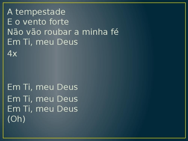 - A tempestadeE o vento forteNão vão roubar a minha féEm Ti, meu Deus4xEm Ti, meu DeusEm Ti, meu DeusEm Ti, meu Deus(Oh)