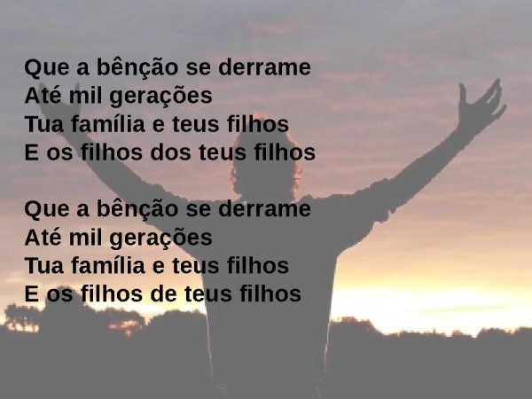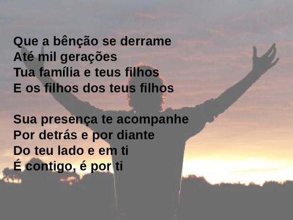 - Que a bênção se derrameAté mil geraçõesTua família e teus filhosE os filhos dos teus filhosSua presença te acompanhePor detrás e por dianteDo teu lado e em tiÉ contigo, é por ti