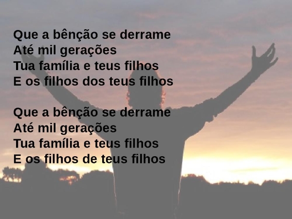 - Que a bênção se derrameAté mil geraçõesTua família e teus filhosE os filhos dos teus filhosQue a bênção se derrameAté mil geraçõesTua família e teus filhosE os filhos de teus filhos