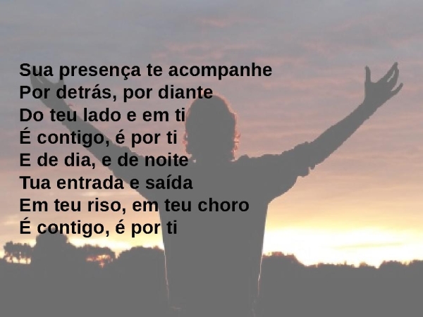- Sua presença te acompanhePor detrás, por dianteDo teu lado e em tiÉ contigo, é por tiE de dia, e de noiteTua entrada e saídaEm teu riso, em teu choroÉ contigo, é por ti