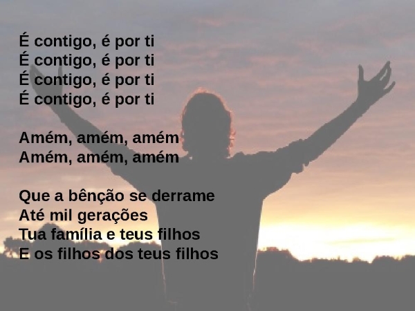 - É contigo, é por tiÉ contigo, é por tiÉ contigo, é por tiÉ contigo, é por tiAmém, amém, amémAmém, amém, amémQue a bênção se derrameAté mil geraçõesTua família e teus filhosE os filhos dos teus filhos