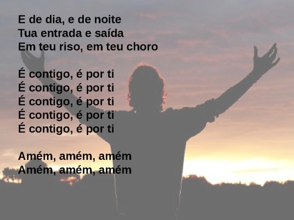 - E de dia, e de noiteTua entrada e saídaEm teu riso, em teu choroÉ contigo, é por tiÉ contigo, é por tiÉ contigo, é por tiÉ contigo, é por tiÉ contigo, é por tiAmém, amém, amémAmém, amém, amém