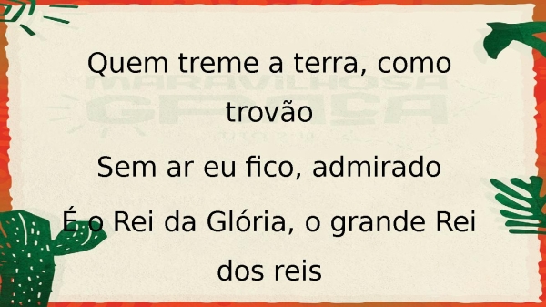 - Quem treme a terra, como trovãoSem ar eu fico, admiradoÉ o Rei da Glória, o grande Rei dos reis