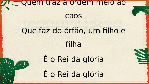 - Quem traz a ordem meio ao caosQue faz do órfão, um filho e filhaÉ o Rei da glóriaÉ o Rei da glória
