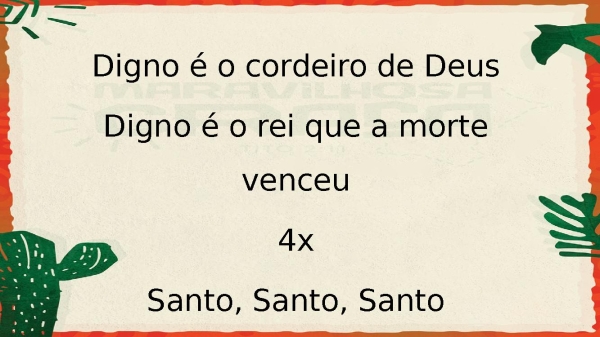 - Digno é o cordeiro de DeusDigno é o rei que a morte venceu4xSanto, Santo, Santo