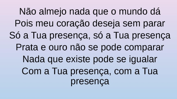- Não almejo nada que o mundo dáPois meu coração deseja sem pararSó a Tua presença, só a Tua presençaPrata e ouro não se pode compararNada que existe pode se igualarCom a Tua presença, com a Tua presença