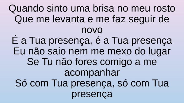 - Quando sinto uma brisa no meu rostoQue me levanta e me faz seguir de novoÉ a Tua presença, é a Tua presençaEu não saio nem me mexo do lugarSe Tu não fores comigo a me acompanharSó com Tua presença, só com Tua presença