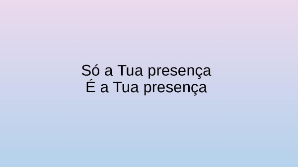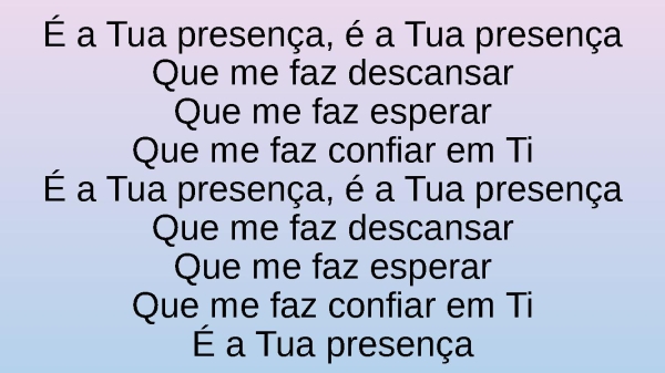 - É a Tua presença, é a Tua presençaQue me faz descansarQue me faz esperarQue me faz confiar em TiÉ a Tua presença, é a Tua presençaQue me faz descansarQue me faz esperarQue me faz confiar em TiÉ a Tua presença