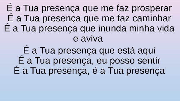 - É a Tua presença que me faz prosperarÉ a Tua presença que me faz caminharÉ a Tua presença que inunda minha vida e aviva É a Tua presença que está aquiÉ a Tua presença, eu posso sentirÉ a Tua presença, é a Tua presença