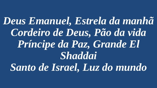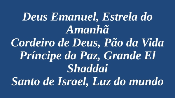 - Deus Emanuel, Estrela do AmanhãCordeiro de Deus, Pão da VidaPríncipe da Paz, Grande El ShaddaiSanto de Israel, Luz do mundo
