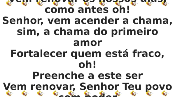 - Vem renovar os nossos dias, como antes oh!Senhor, vem acender a chama, sim, a chama do primeiro amorFortalecer quem está fraco, oh!Preenche a este serVem renovar, Senhor Teu povo com poder