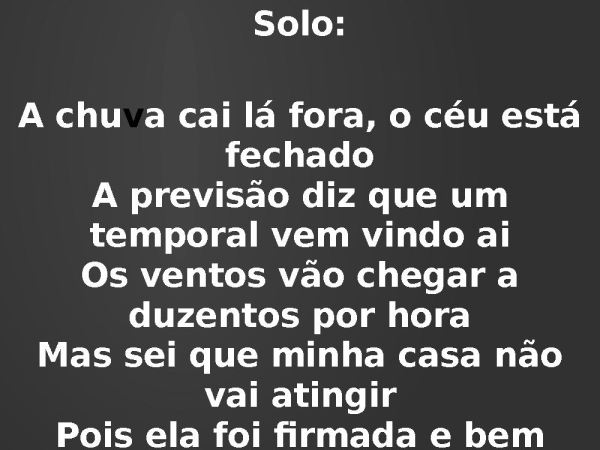 - A chuva cai lá fora, o céu está fechadoA previsão diz que um temporal vem vindo aiOs ventos vão chegar a duzentos por horaMas sei que minha casa não vai atingirPois ela foi firmada e bem projetadaE o arquiteto é Jesus de NazaréSolo: