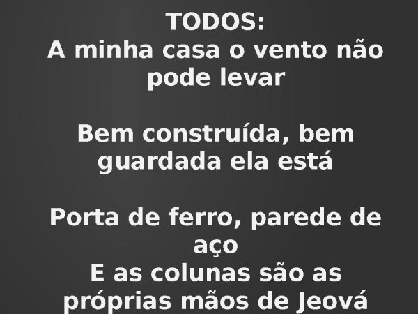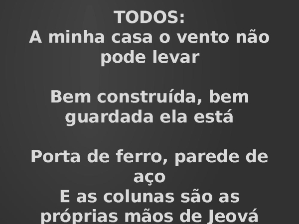 - TODOS:A minha casa o vento não pode levarBem construída, bem guardada ela estáPorta de ferro, parede de açoE as colunas são as próprias mãos de Jeová