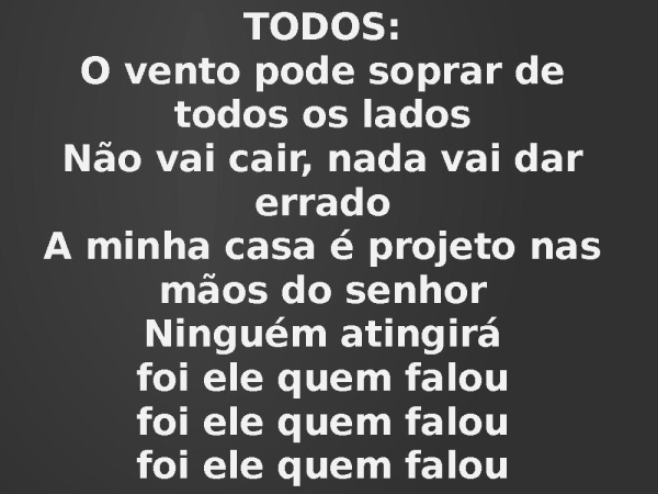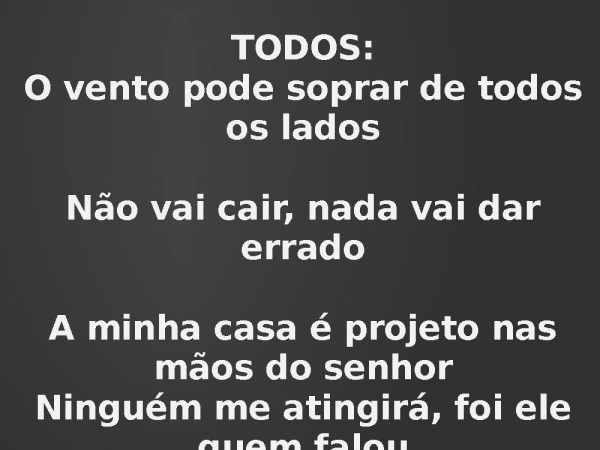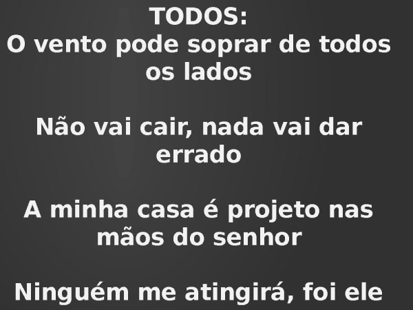 - TODOS:O vento pode soprar de todos os ladosNão vai cair, nada vai dar erradoA minha casa é projeto nas mãos do senhorNinguém me atingirá, foi ele quem falou